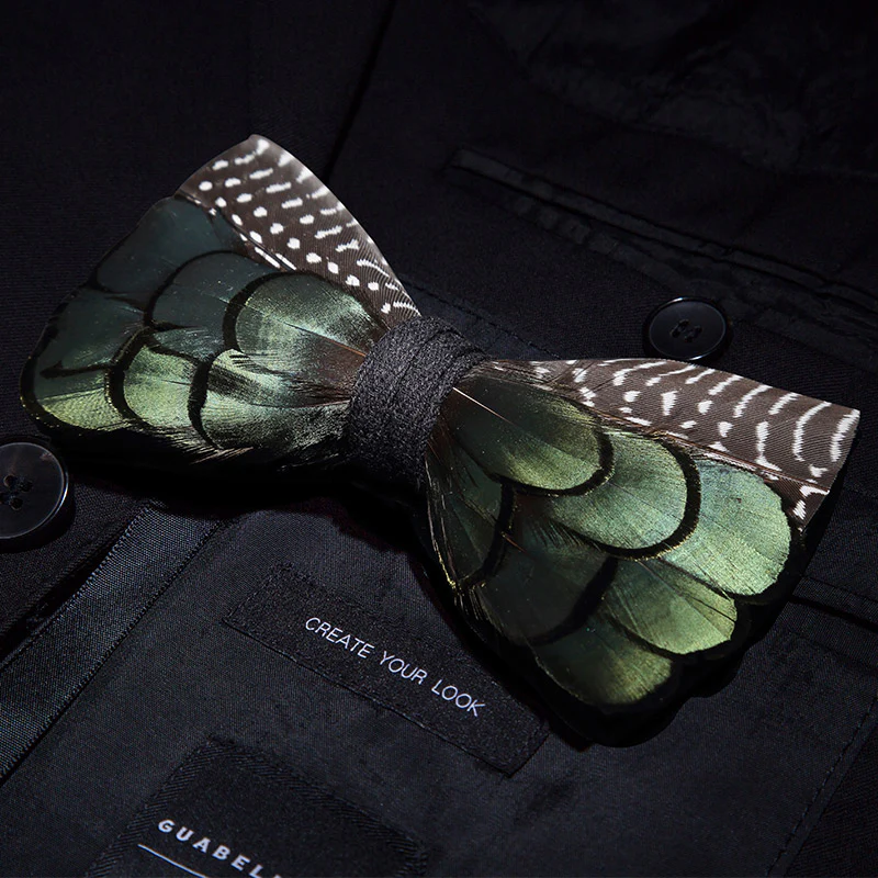 The Maverick Feather bow tie is the perfect groom's tie. This dark forest green bow tie is sophisticated and goes with black, gray, tan, and navy suits. Its versatility makes it the perfect wedding bow tie. Pair this green with other matching ties or use similar natural green styles such as our Hunter and Weston. It is a classic, understated, and unique groom's tie. Perfect for weddings and special events. An absolute must-have bow tie to add to your collection.